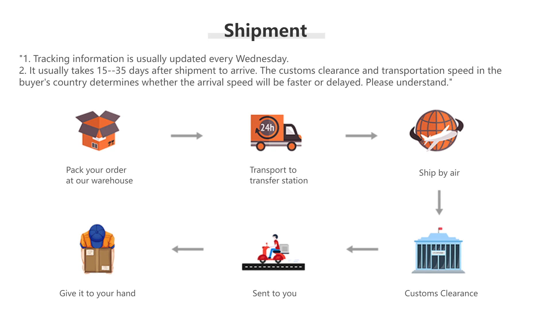 • Our standard shipping typically takes 8-12 working days from the date of order processing for your package to reach its destination. Please bear in mind that this is an estimate, and actual delivery times may vary due to factors beyond our control, such as customs clearance, weather conditions, or any unforeseen circumstances.
