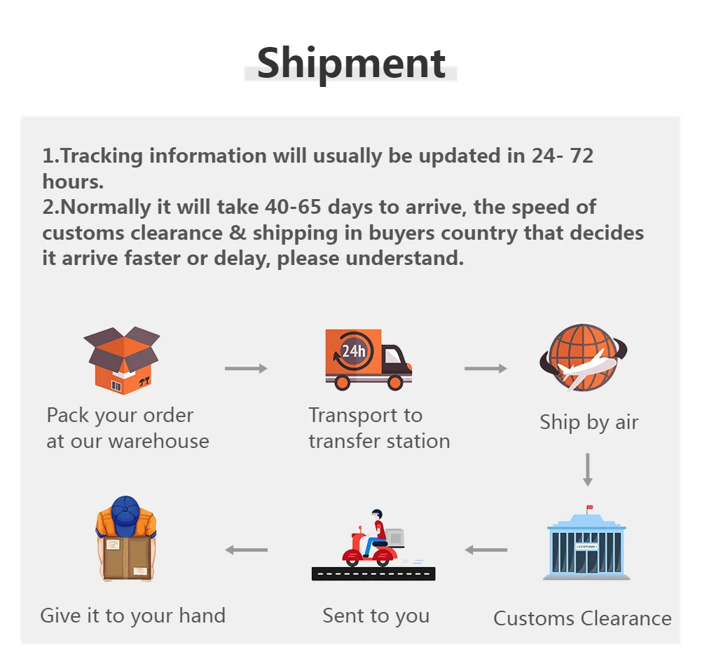• Our standard shipping typically takes 8-12 working days from the date of order processing for your package to reach its destination. Please bear in mind that this is an estimate, and actual delivery times may vary due to factors beyond our control, such as customs clearance, weather conditions, or any unforeseen circumstances.