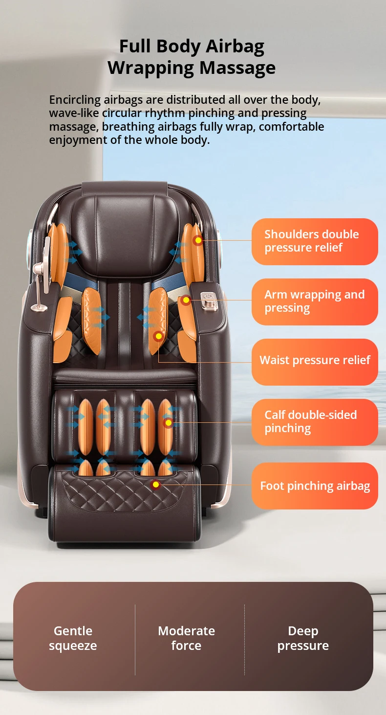 Encircling airbags are distributed all over the body, wave-like circular rhythm pinching and pressing massage, breathing airbags fully wrap, comfortable enjoyment of the whole body.