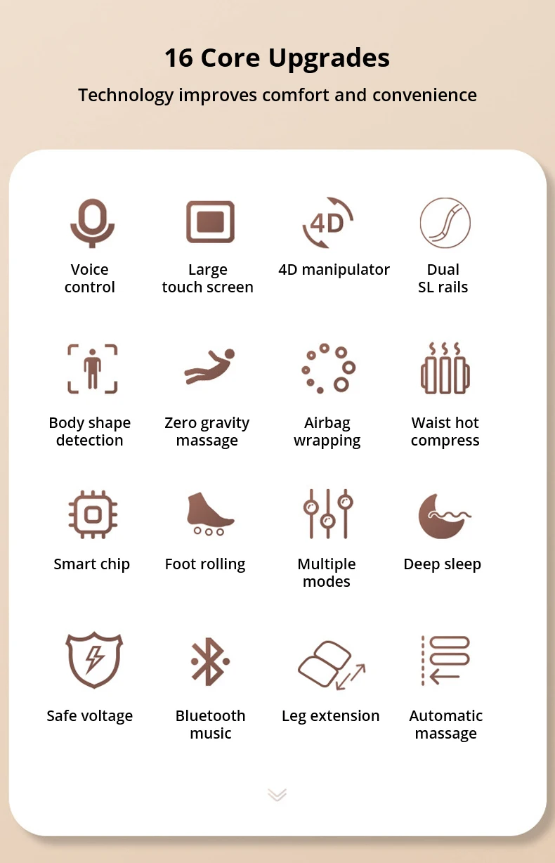The new generation movement uses extended double SL rails, with a longer massage stroke, fitting the back curve of the human body, and precise massage