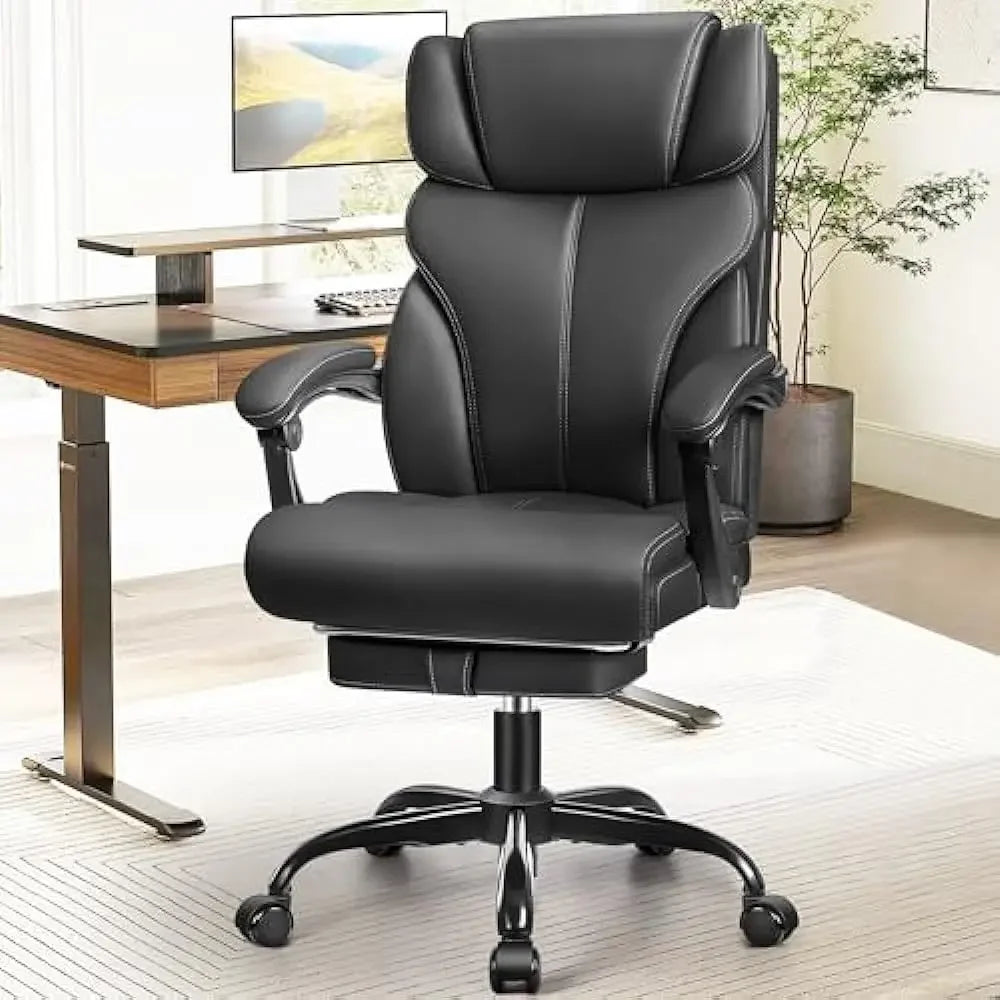 - Executive Leather Chair: Why is the office chair with a footrest more comfortable to sit in? Breathable and easy-to-clean PU leather upholstery provides consistent comfort by ensuring ventilation and maintaining coolness The five-layer cushion structure prevents collapses, where PP cotton and high-density sponge padding provide immersive enjoyment, and the silent spring seat (20 spring packs) guarantees that the cushion is appropriately elastic and not easily deformed.