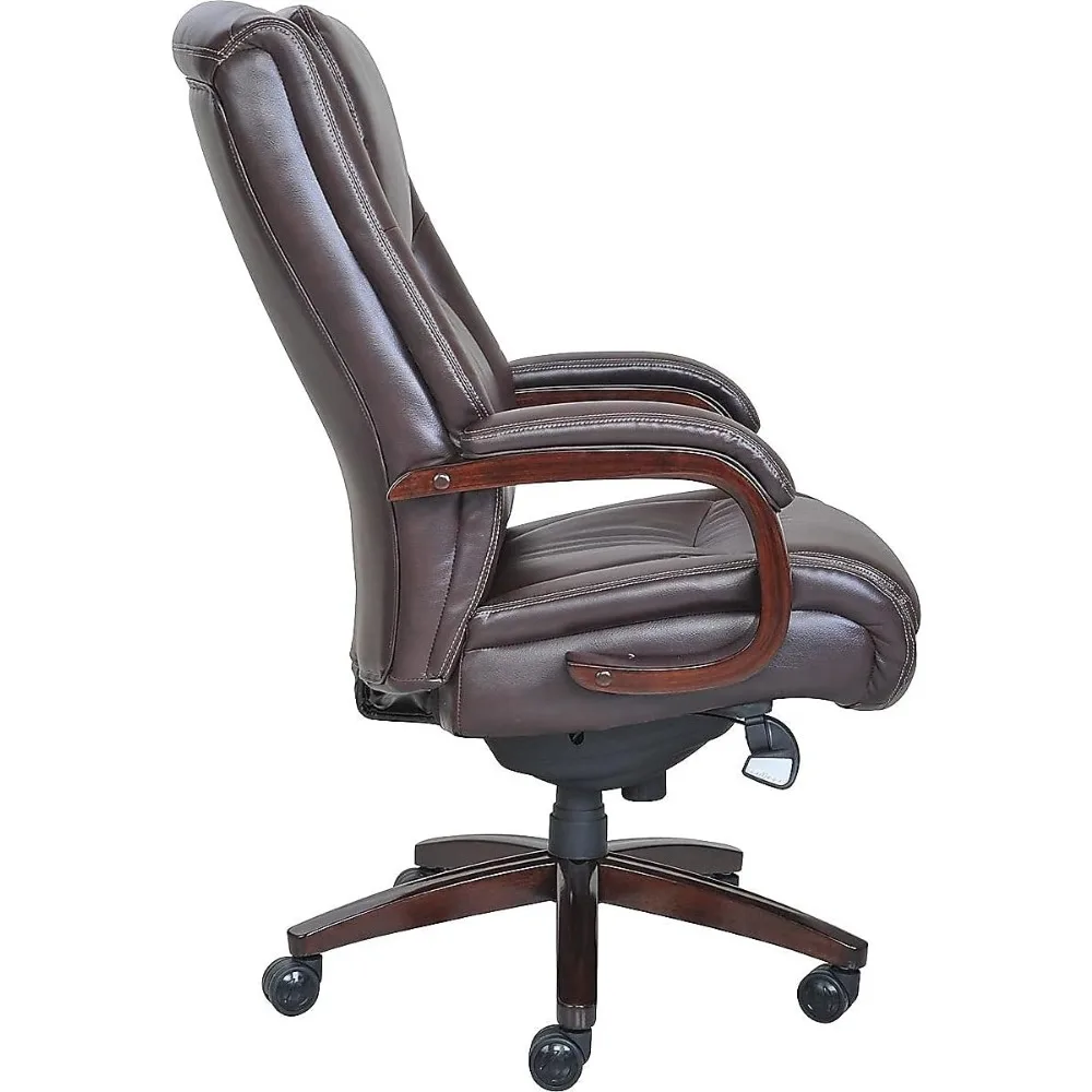 Boost your office's overall look with this Winston brown bonded leather executive office chair. Bring an air of sophistication to your office with this Winston executive office chair. The rich brown bonded leather upholstery and wood-finish accents lend a classic look to this piece, while the five-star base and rolling casters provide effortless mobility. An elevated headrest lets you sit back and relax at the end of a long conference call, providing a plush, pillow-like surface for your head and neck. Support your upper body with the padded loop arms and rest tired and stiff muscles with the built-in lumbar support.