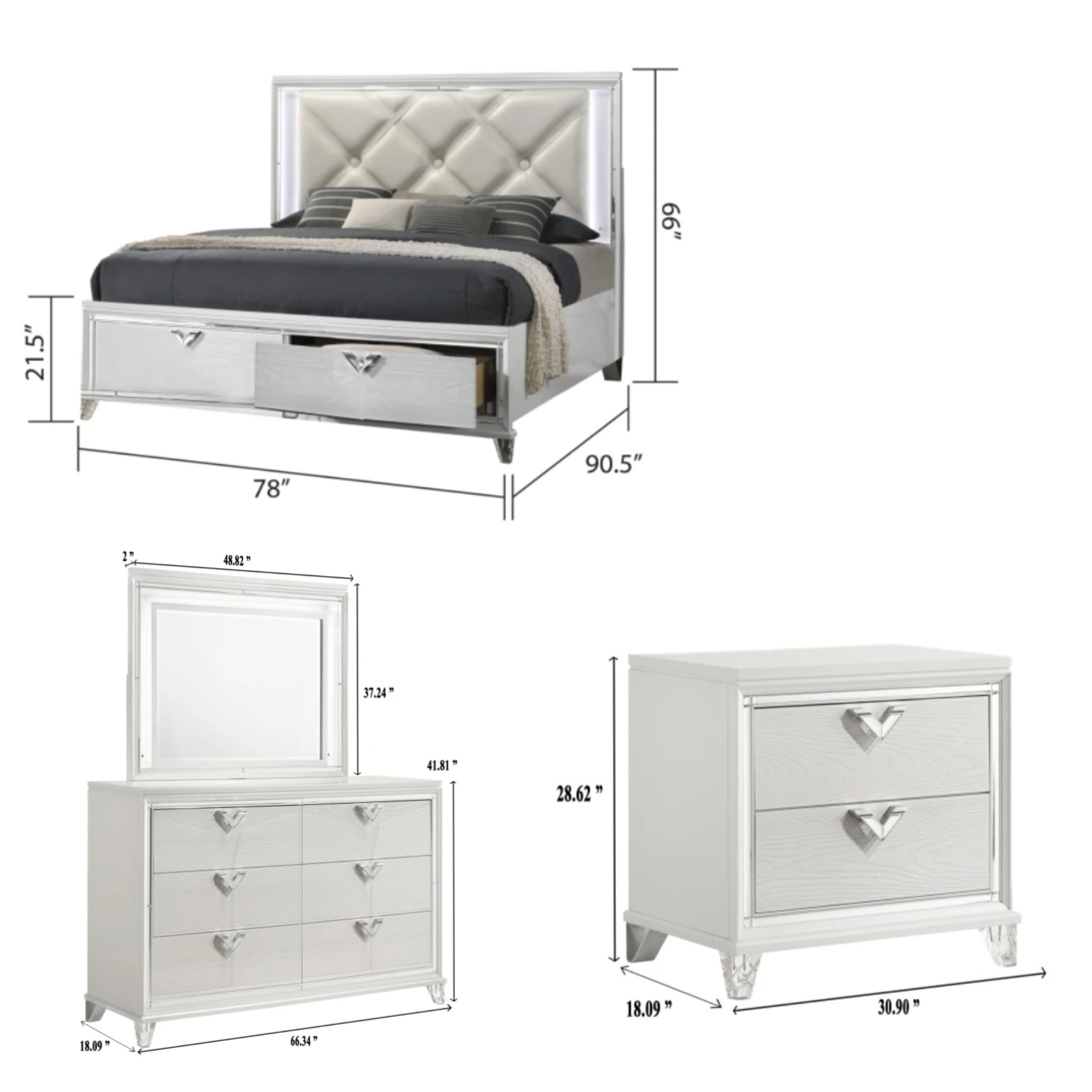 Bedroom set Dimensions :Queen Bed Dimensions : 90"L X 67"W X 70"H , Mirror Dimensions : 4.5"L X 50"W X 60"H , vanity set Dimensions : 18"L X 62"W X 34"H , Nightstand Dimensions : 18"L X 27"W X 26.5"H