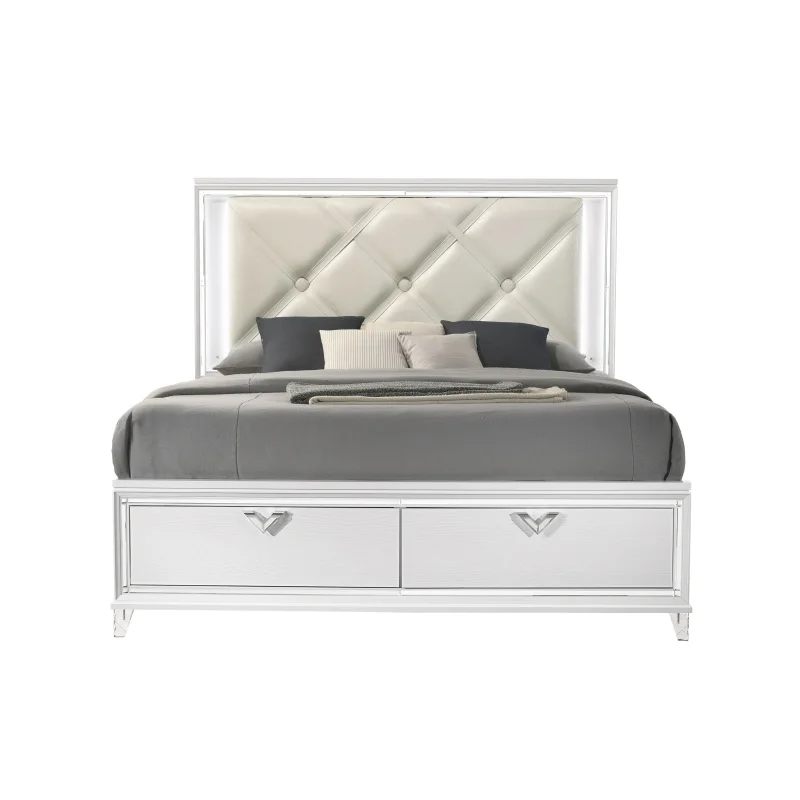 The set includes a Queen bed with a champagne-toned, crystal button-tufted headboard, accompanied by LED-light accents for a contemporary flair.
