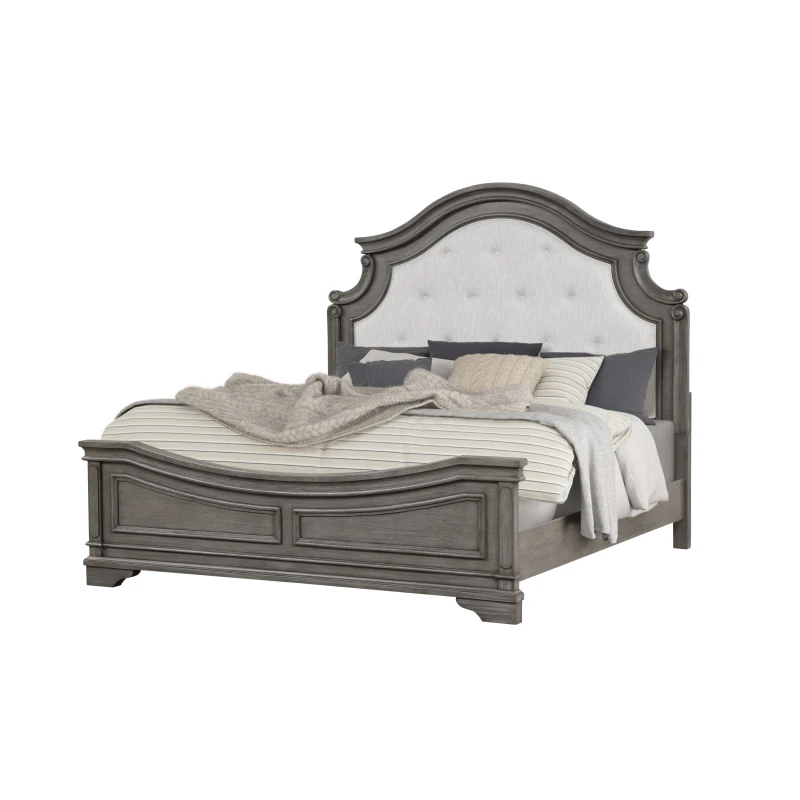 Curved, fabric-upholstered headboard with classic moldings.