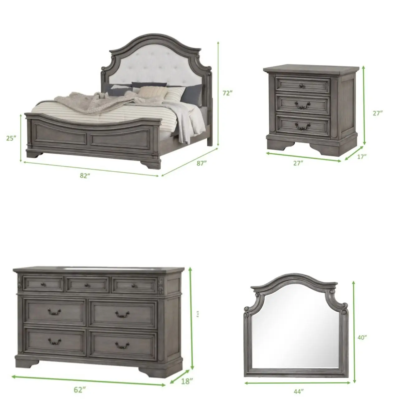 ·Pieces Included: Bed; Nightstand; Dresser; Dresser Mirror